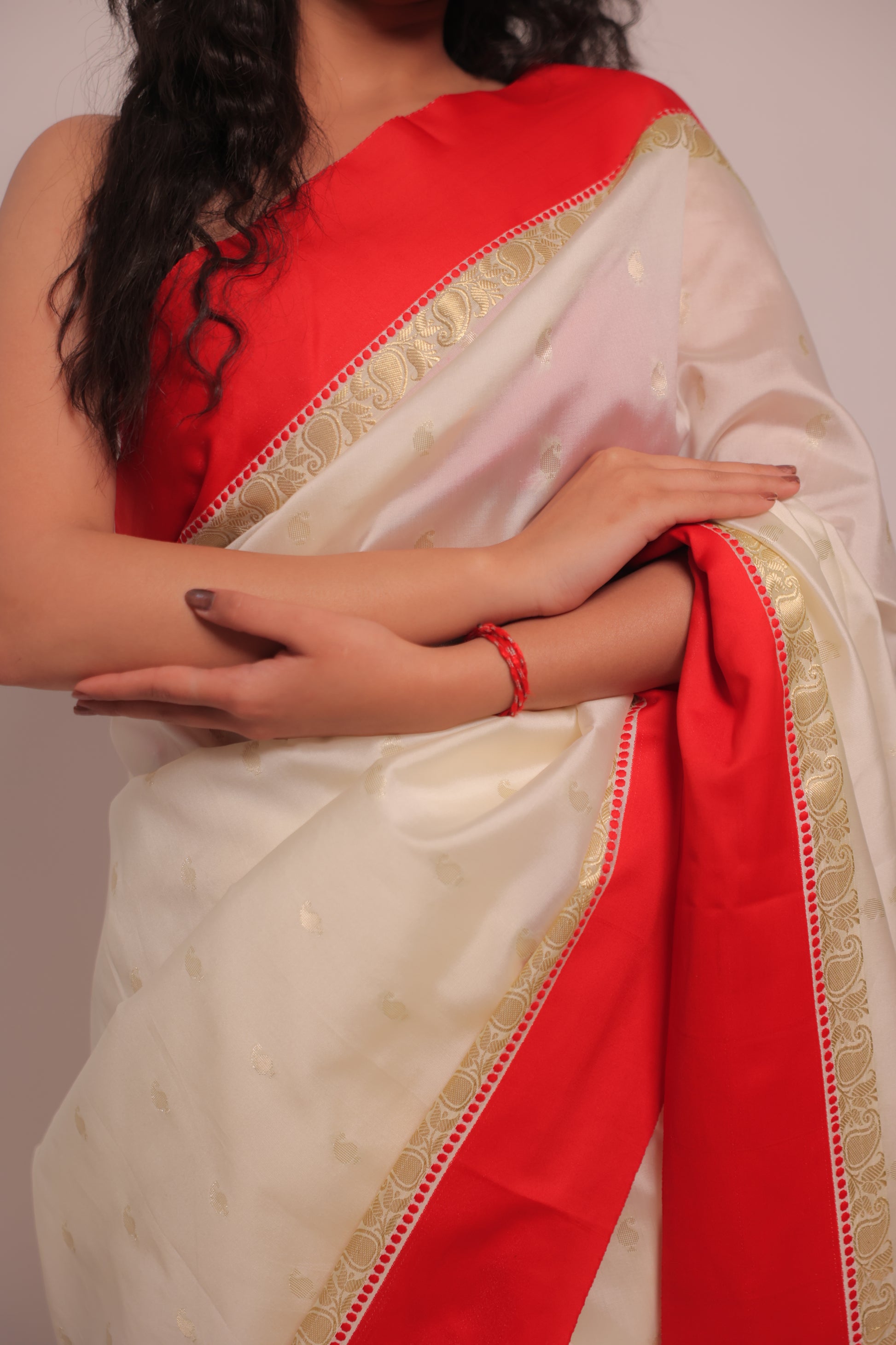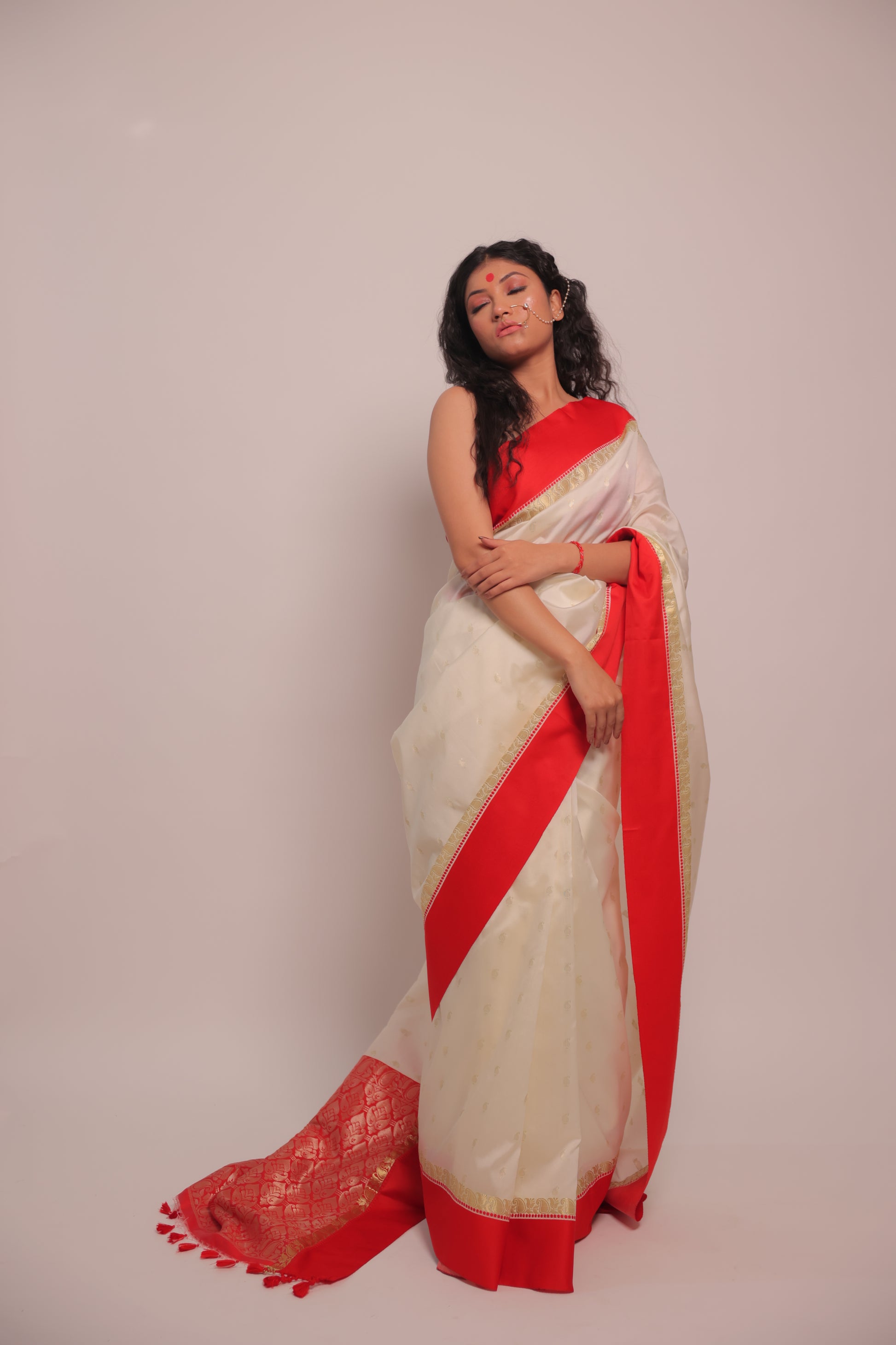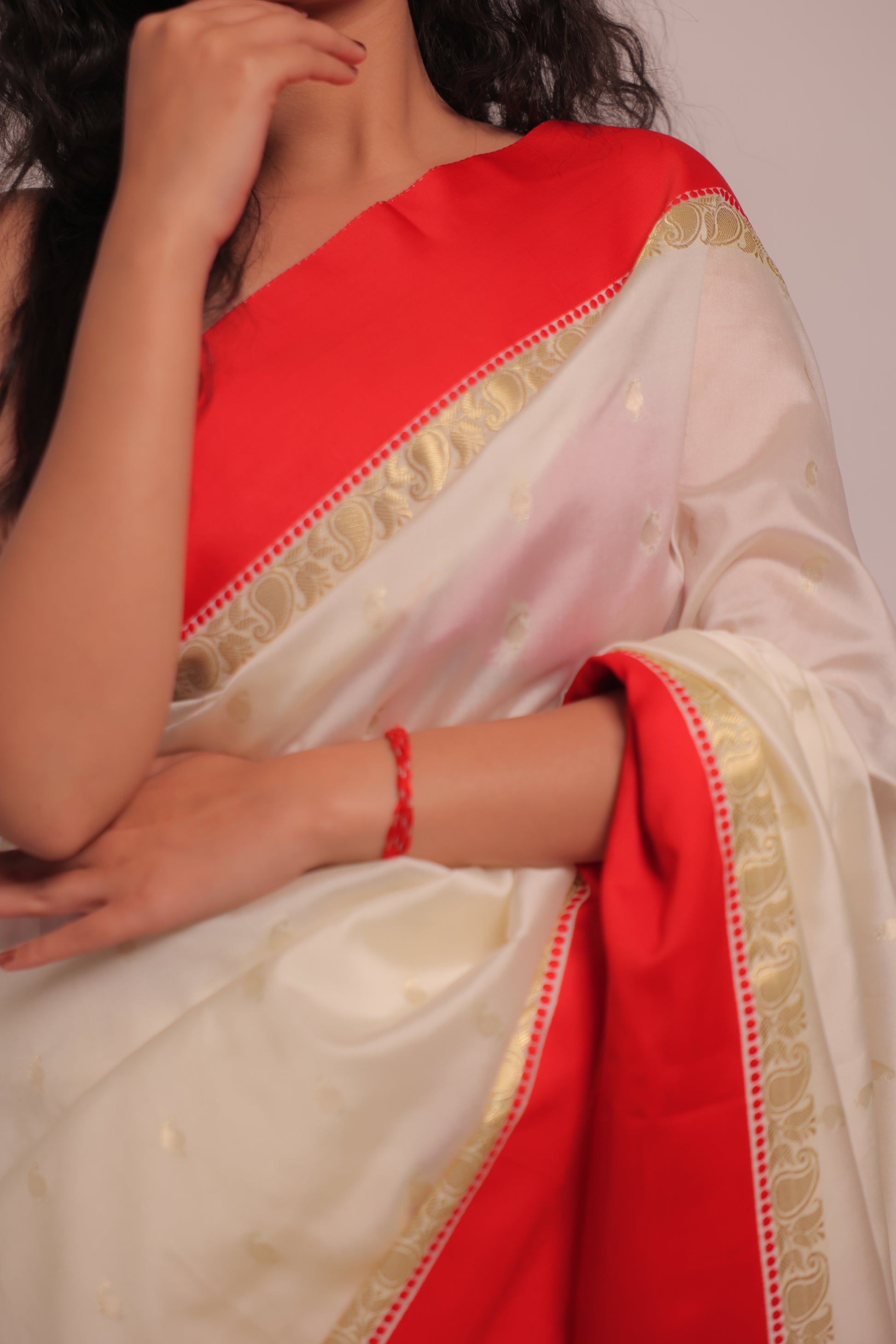 Kunti brings together the timeless contrast of white and red, woven in pure raw silk. Its minimal plain weave is elevated by the richness of Banarasi craftsmanship, perfect for cultural moments and graceful gatherings.