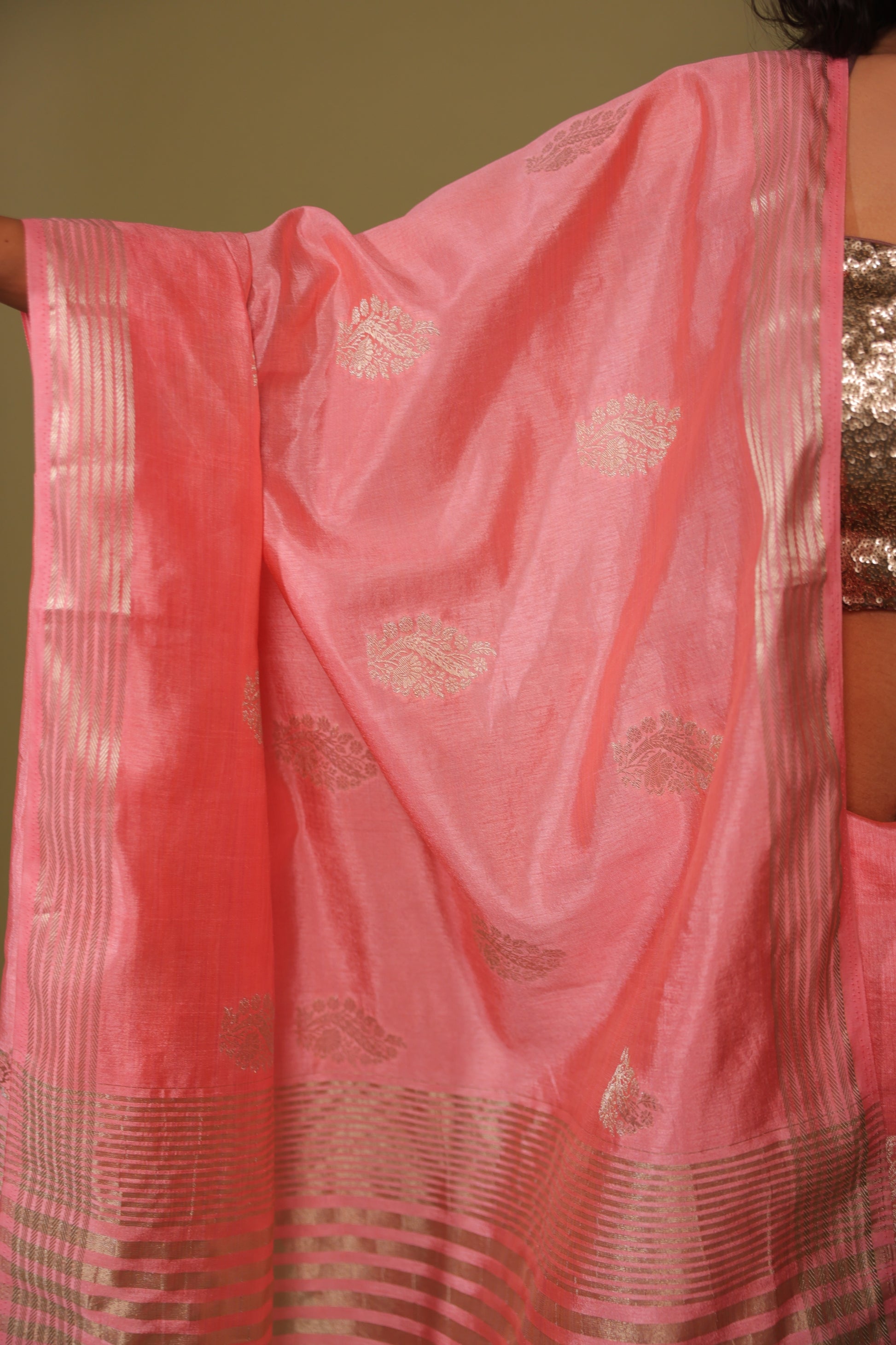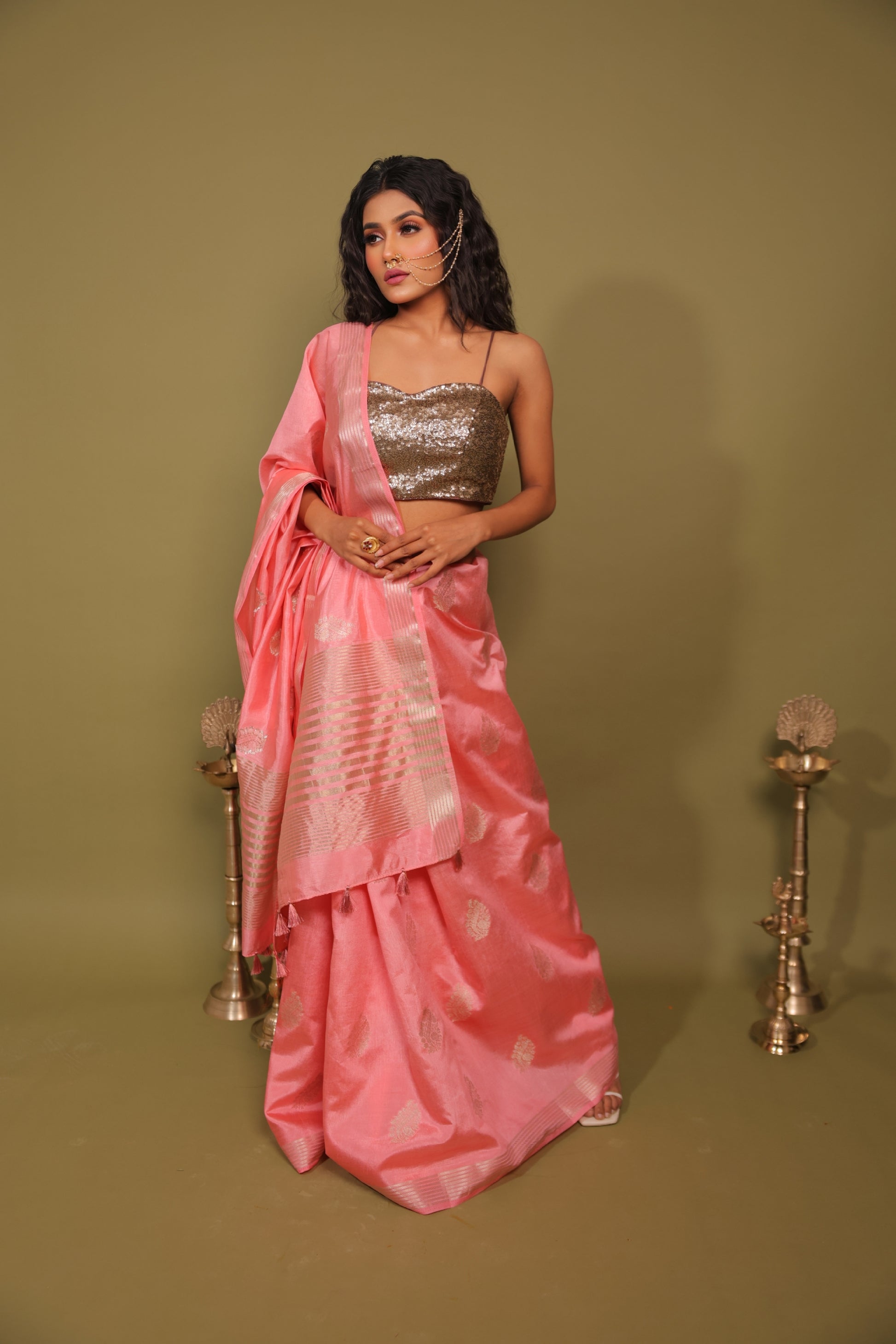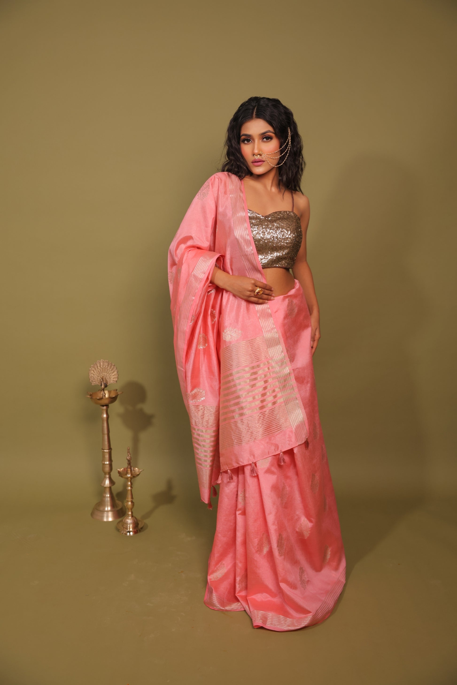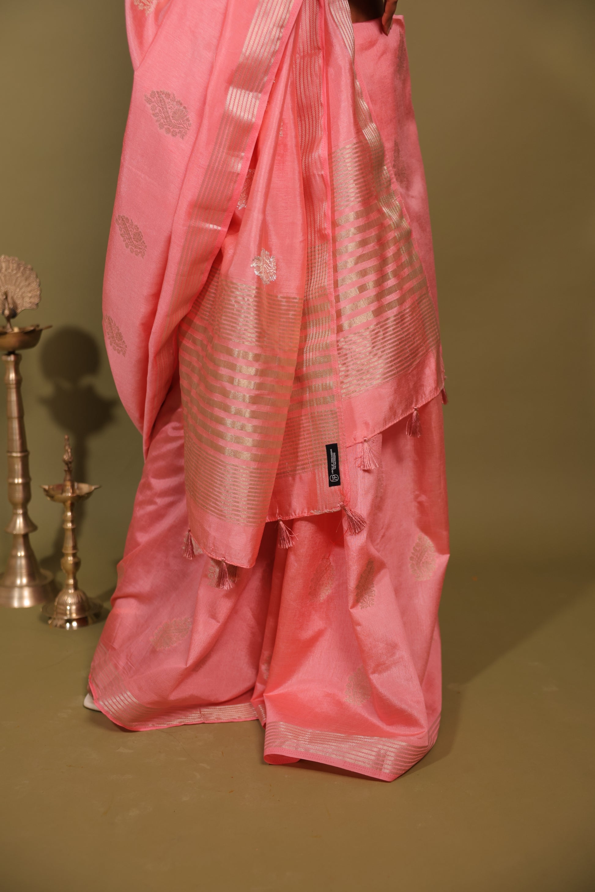 Lucid Dream is a serene melody in baby pink, woven in sumptuous raw silk that whispers elegance with every fold. The saree is adorned with subtle motifs scattered gracefully across its body, while an artful interplay of thick and thin zari lines and parallel thin stripes adds depth and modern refinement to this timeless drape.
