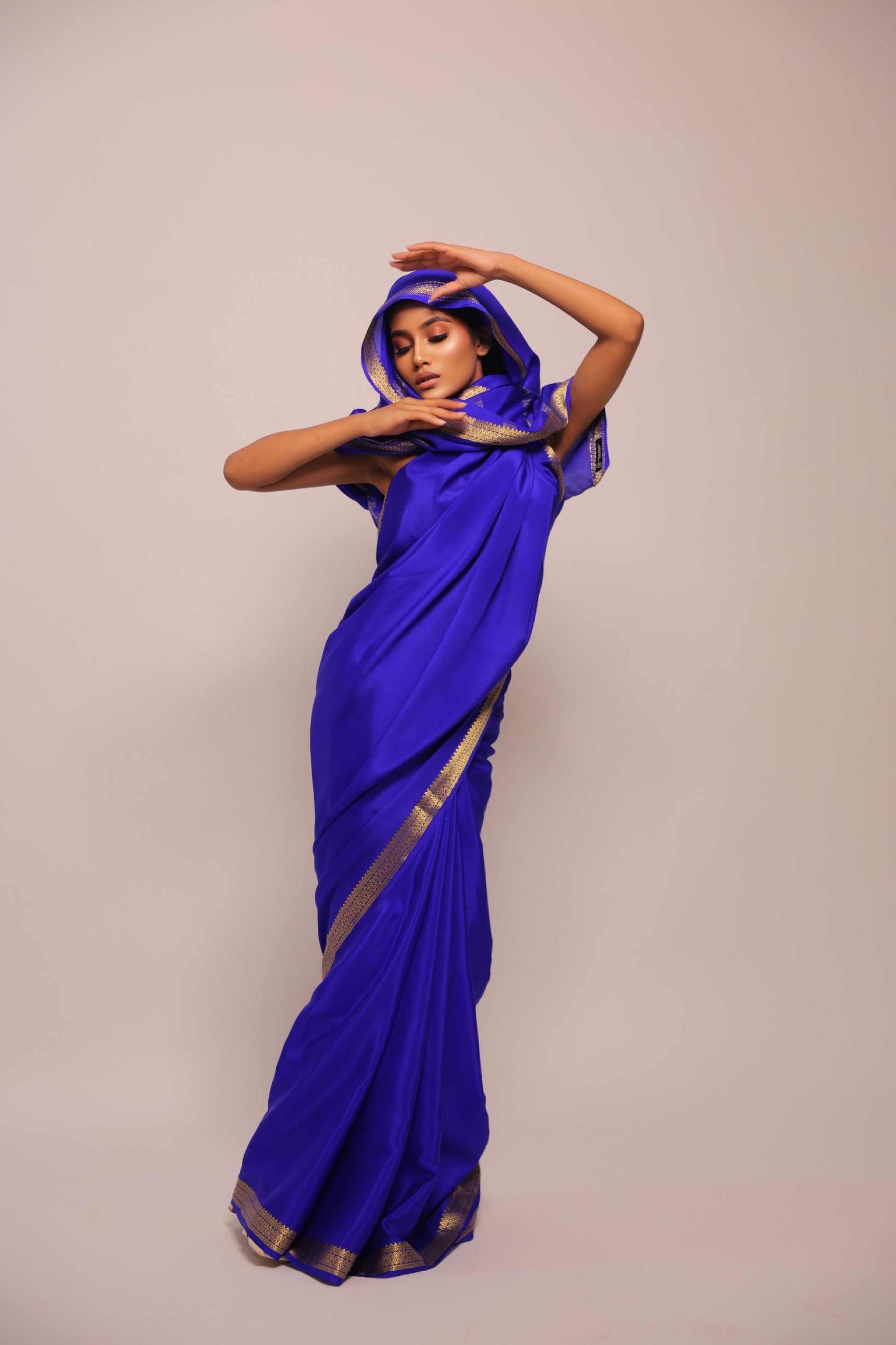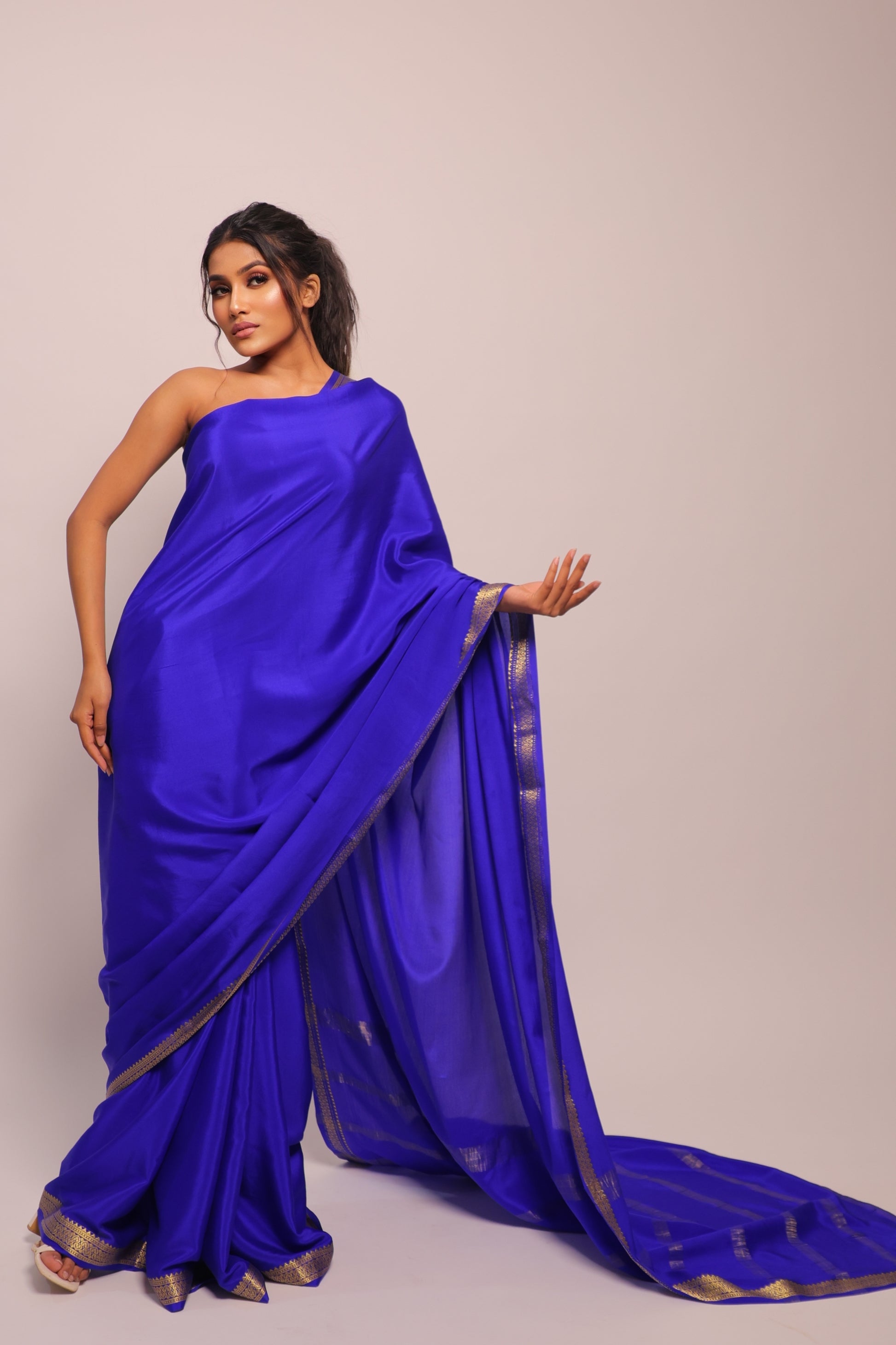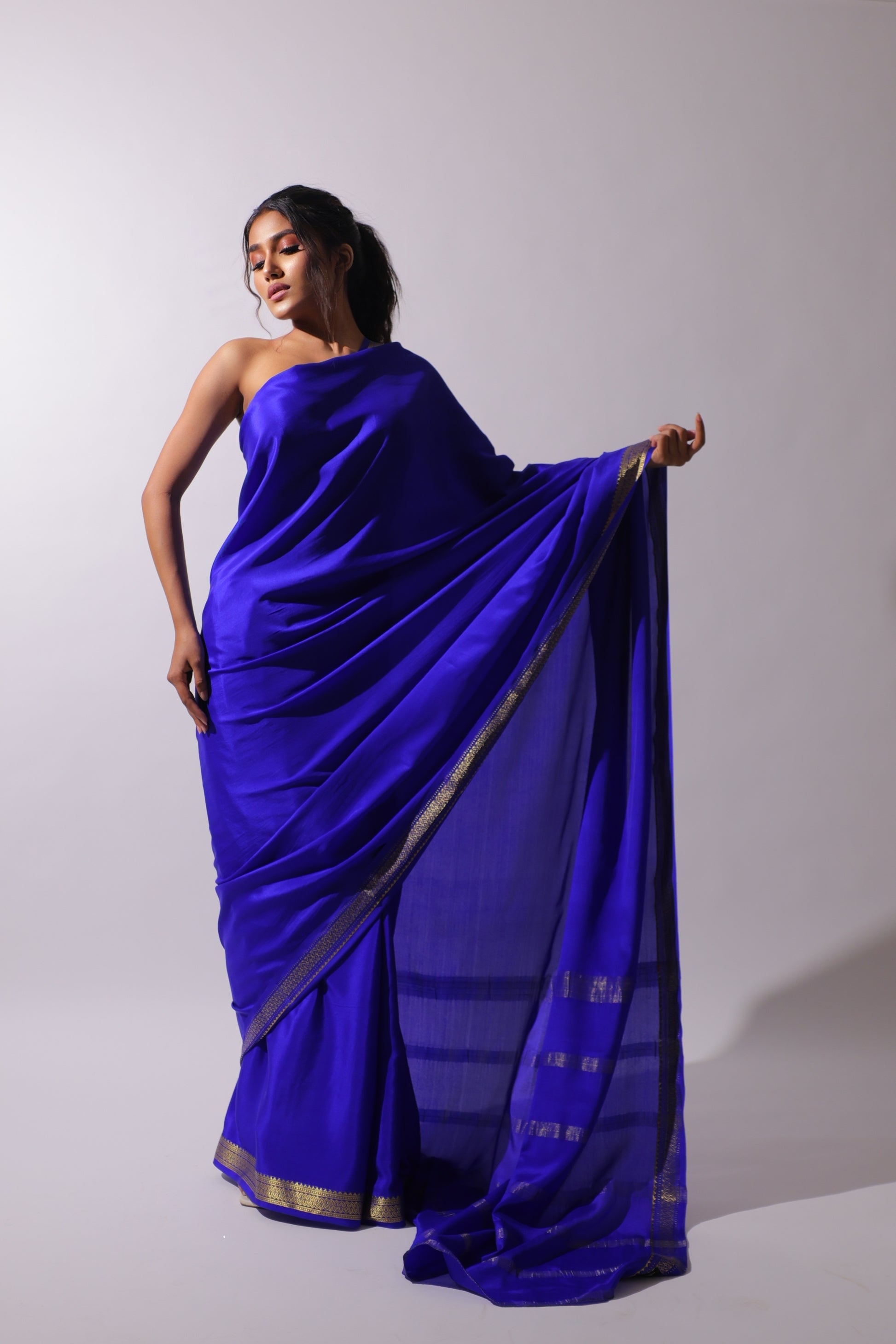Mysore silk — soft, lustrous, and luxurious, offering a rich, regal feel with a graceful drape.