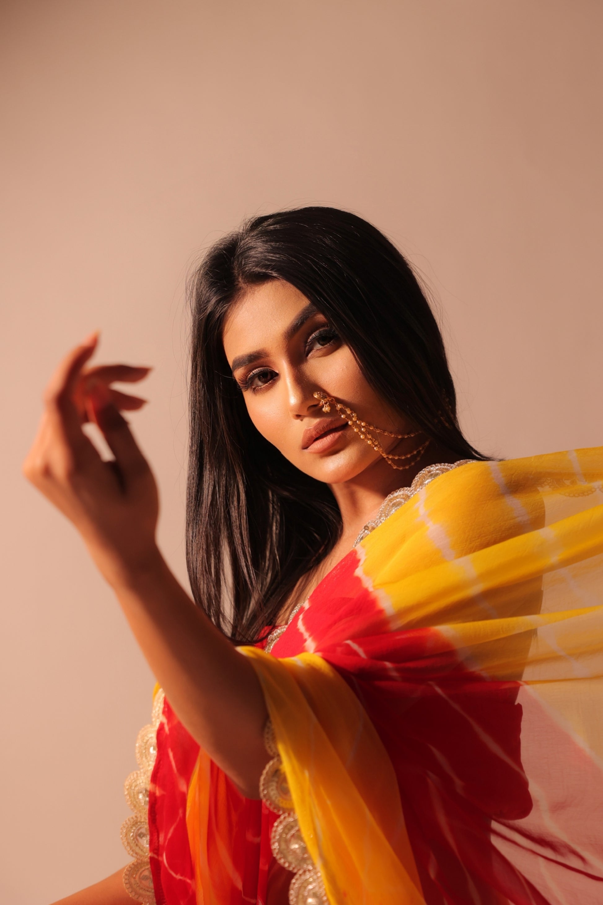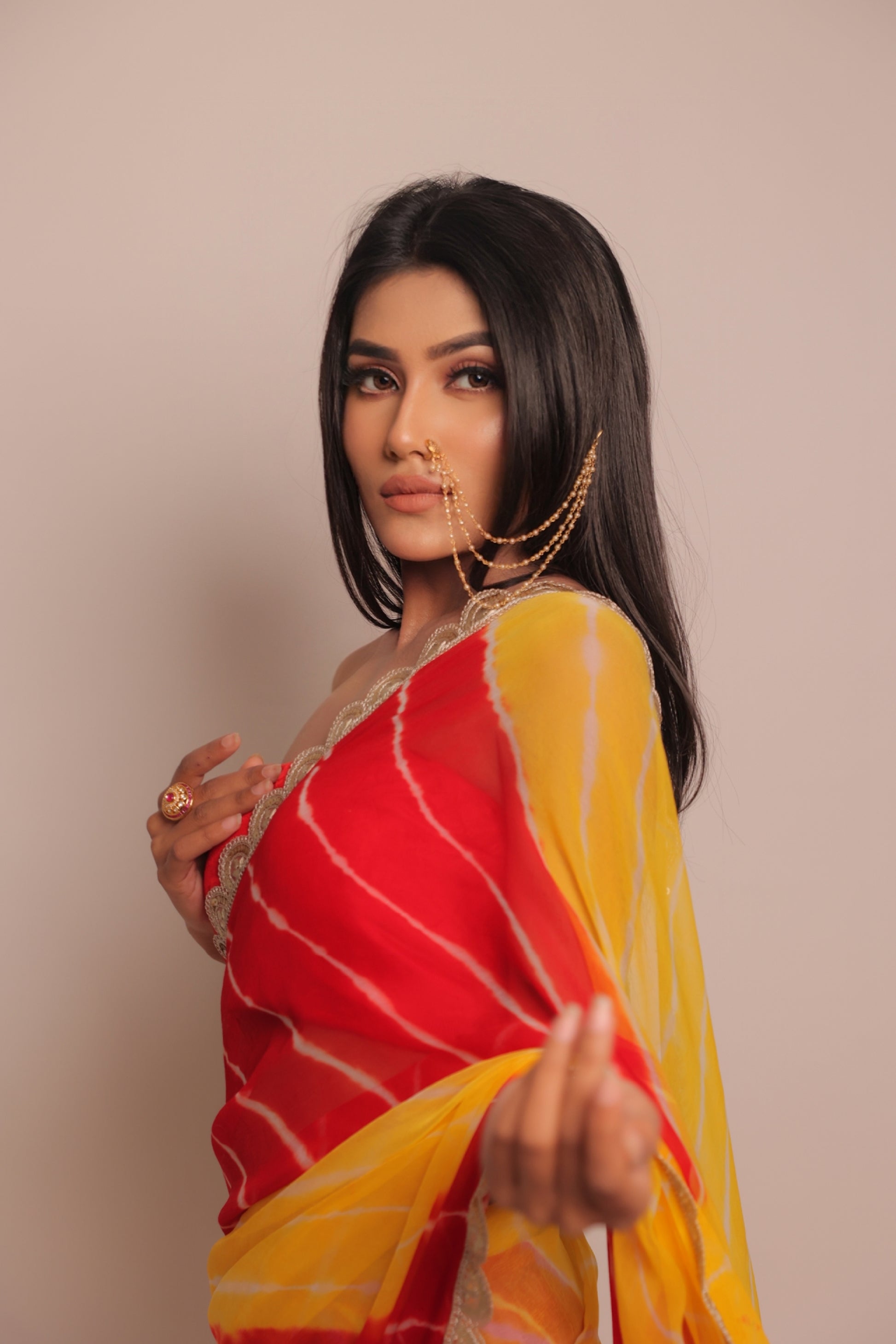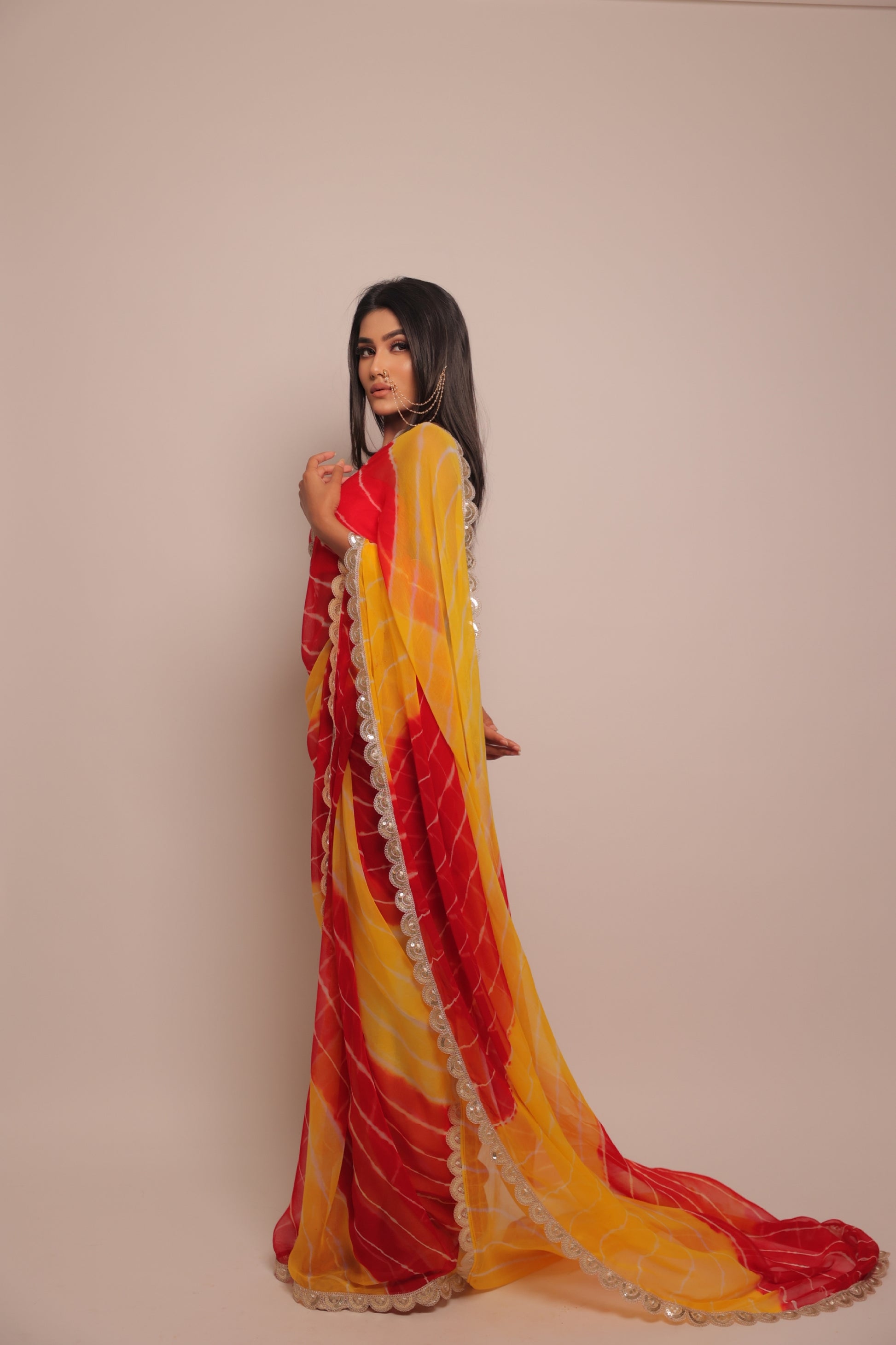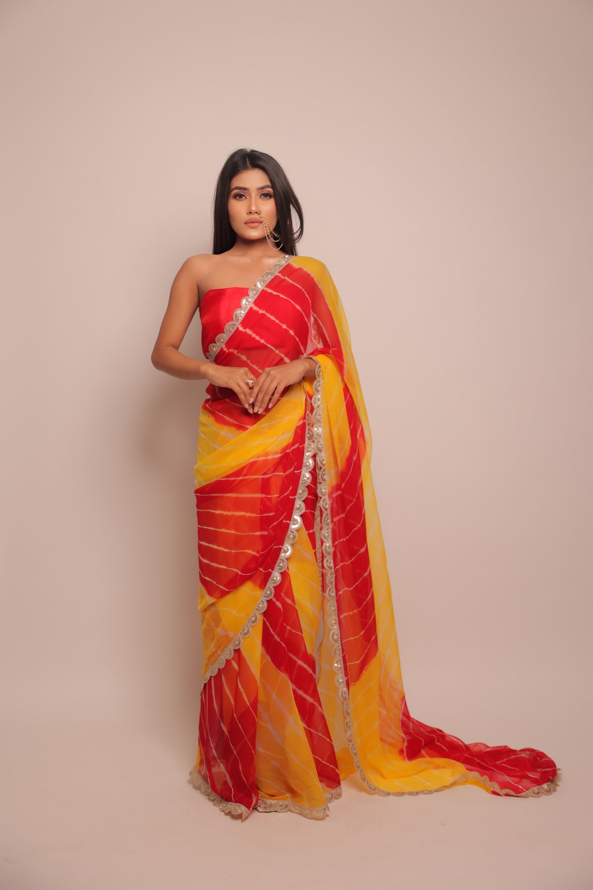 Dyed in vivid shades of yellow and red using the traditional Leheriya technique, the saree showcases natural waves of color with rich cultural resonance. The look is completed with a scalloped lace border, offering a romantic and feminine flourish.