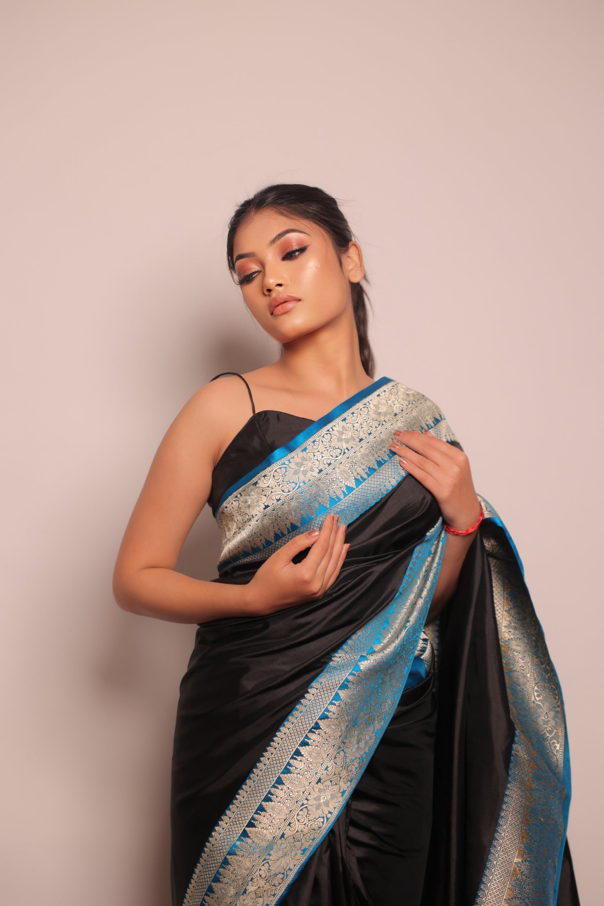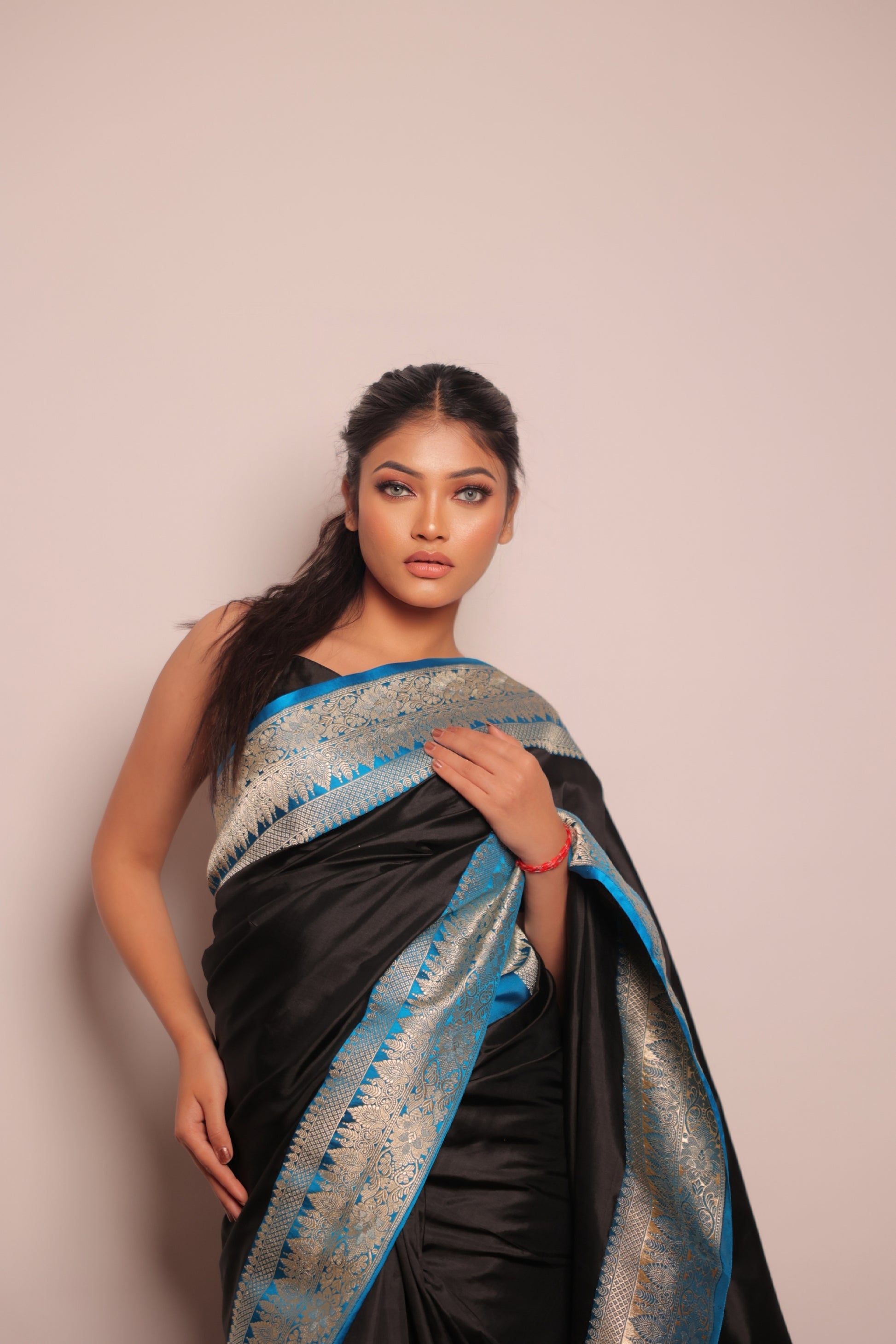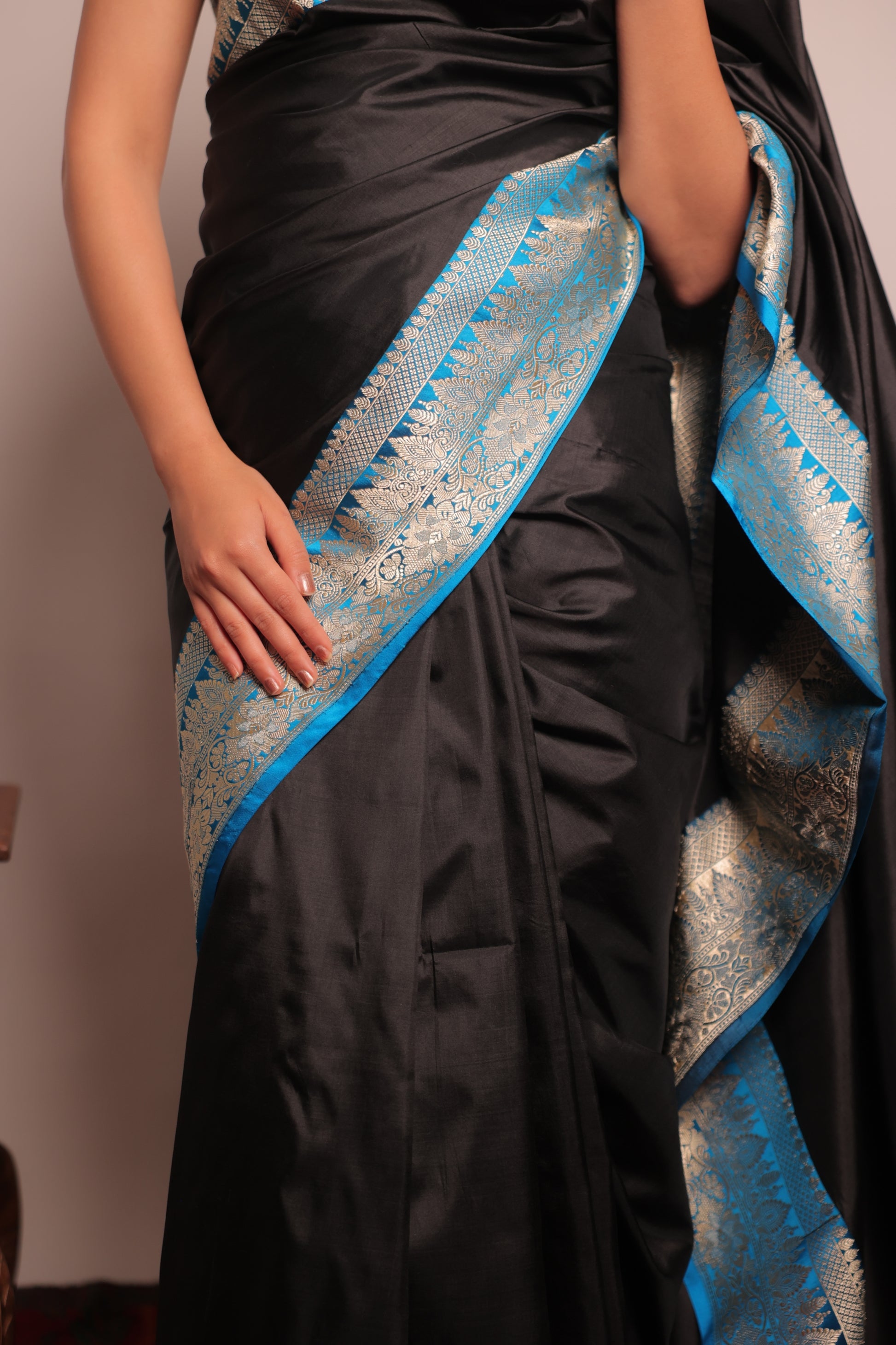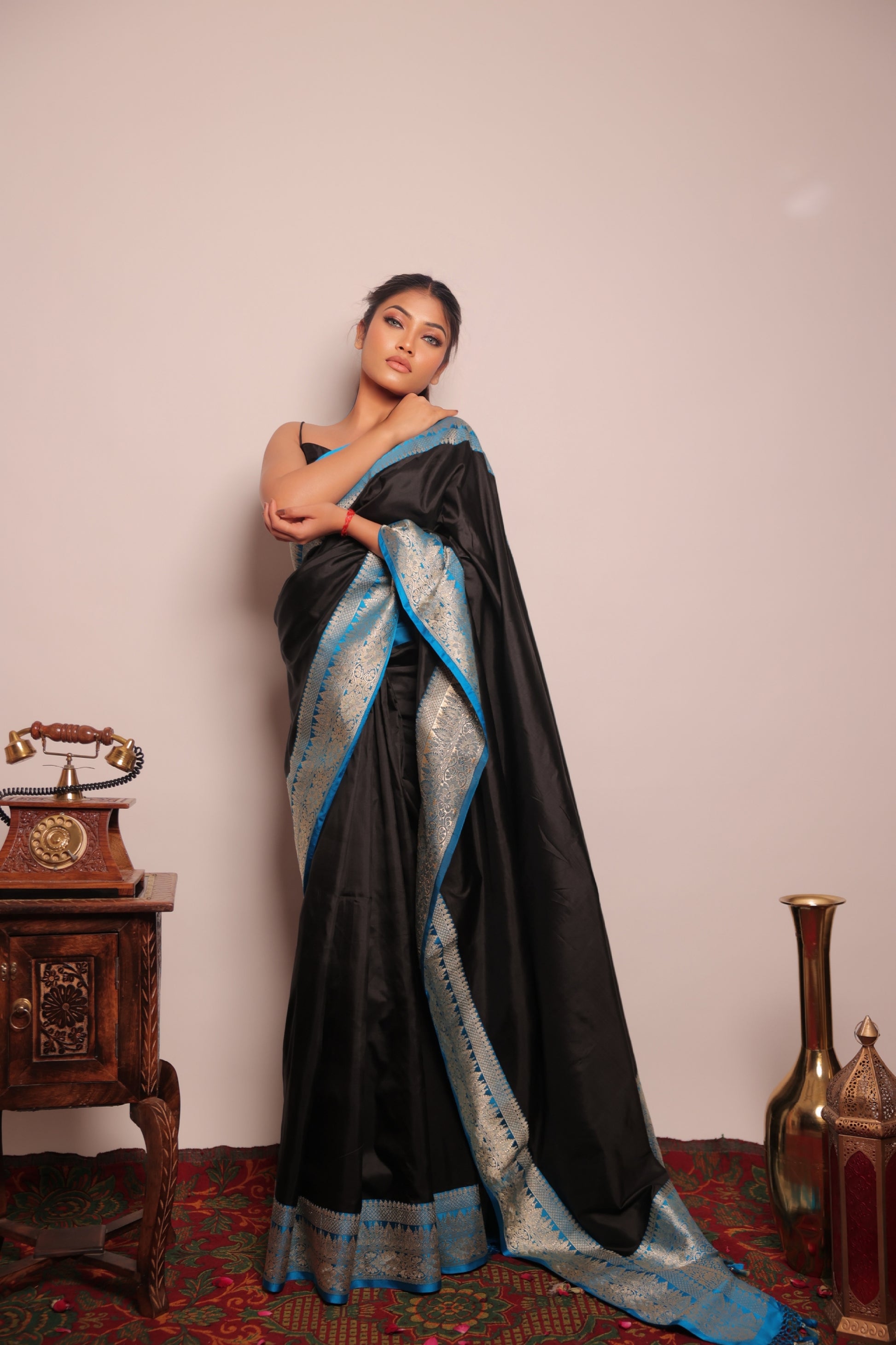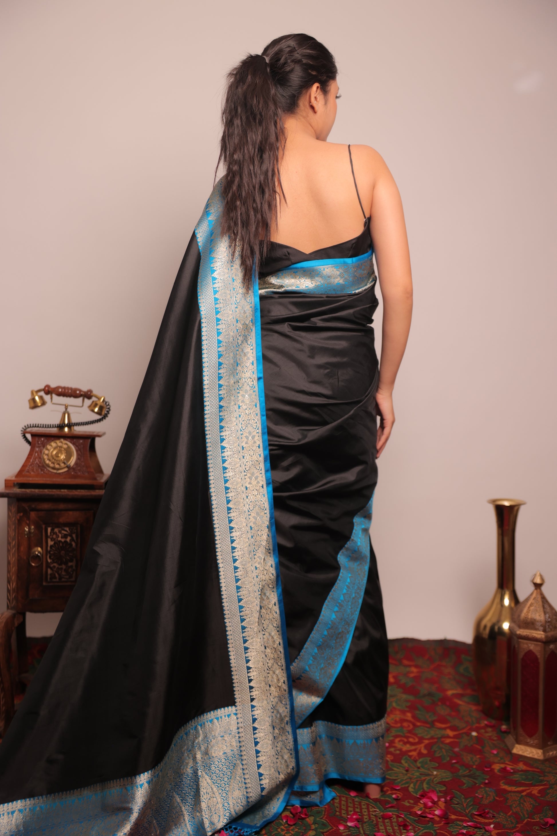 Midnight Rush is a striking Banarasi handloom saree in pure Katan silk, rendered in a deep black base. The saree features a rich blue walkalam-style pallu, showcasing traditional motifs, and is elevated by a broad silver zari border, creating a dramatic yet graceful aesthetic. This saree is a statement piece, perfect for celebrations that demand timeless grandeur.