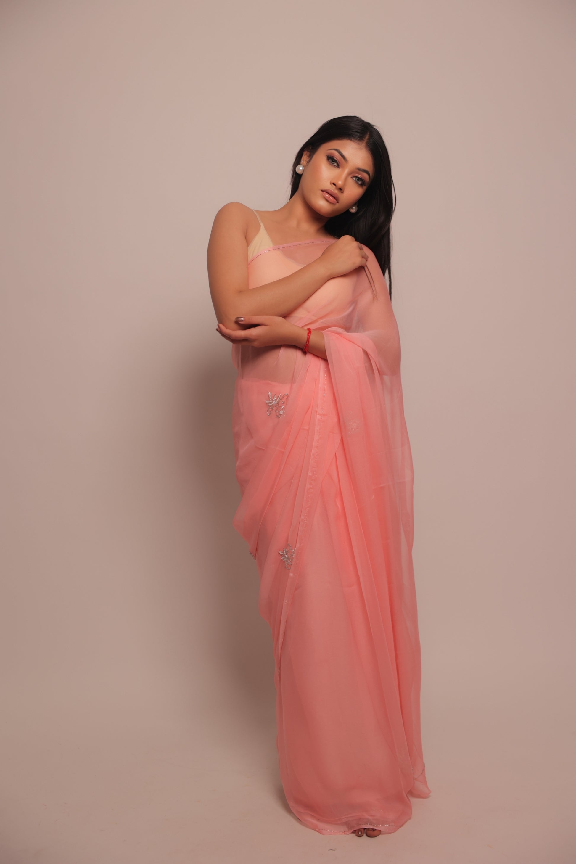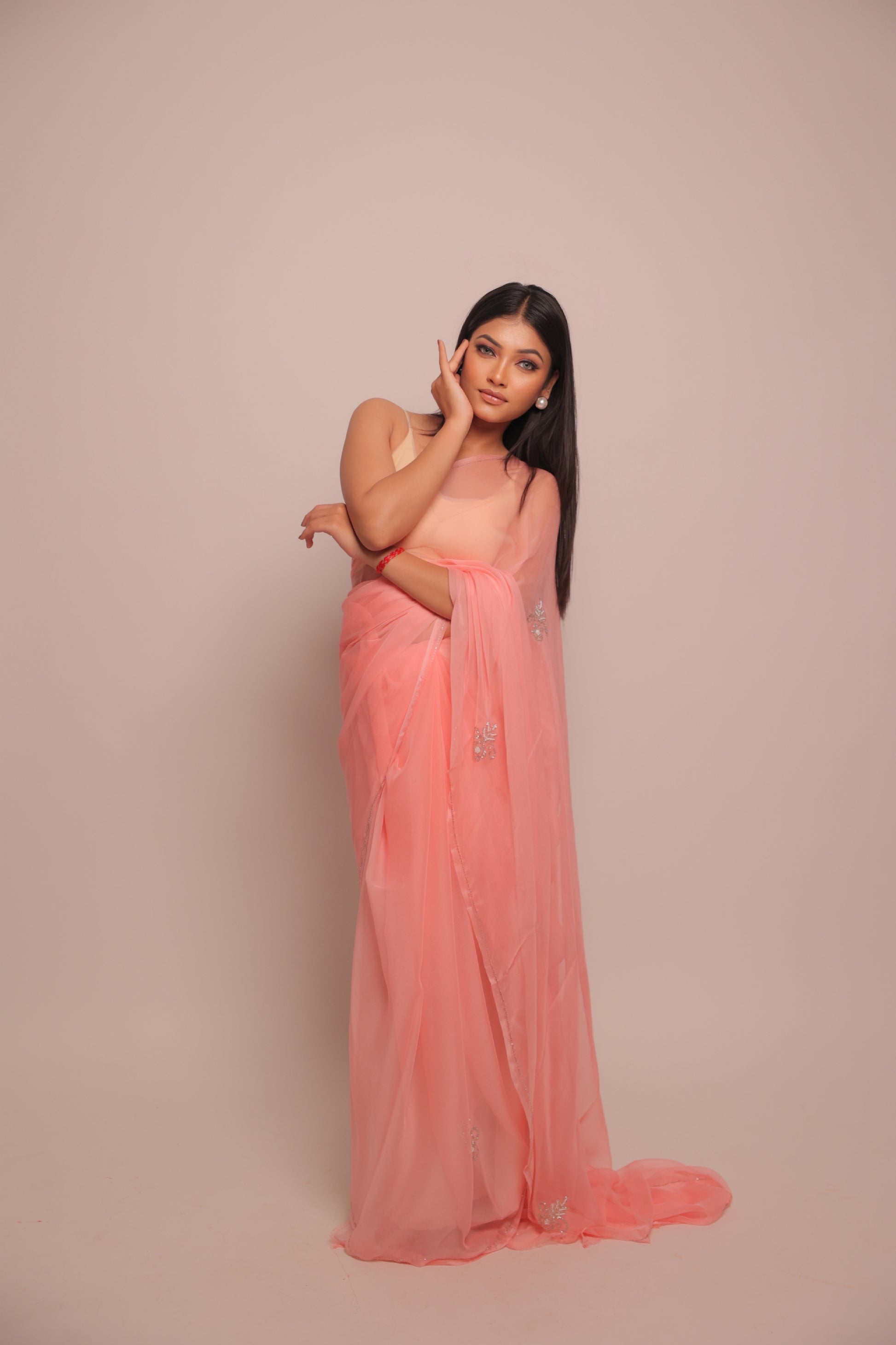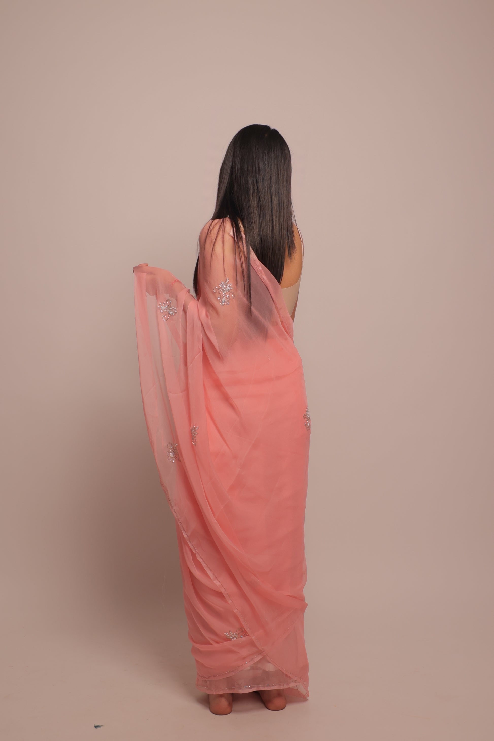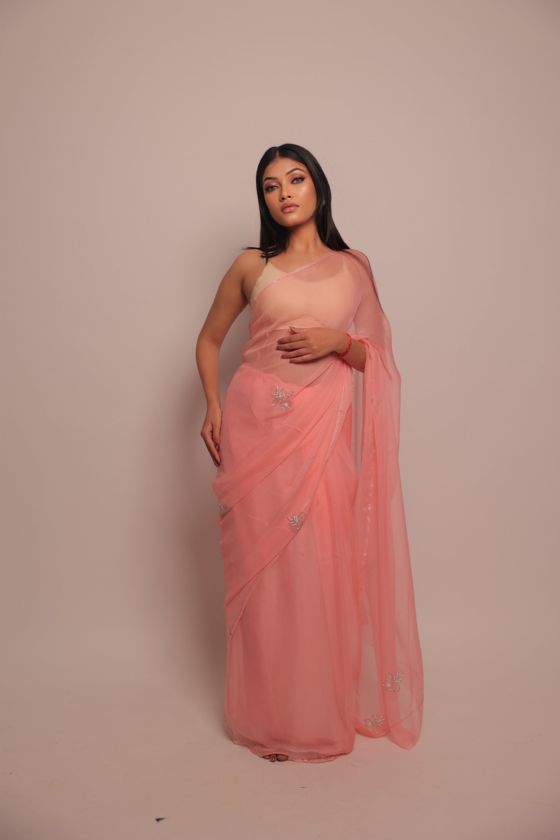Pure chiffon — fluid, sheer, and effortlessly graceful, offering a dreamy drape that complements every movement.