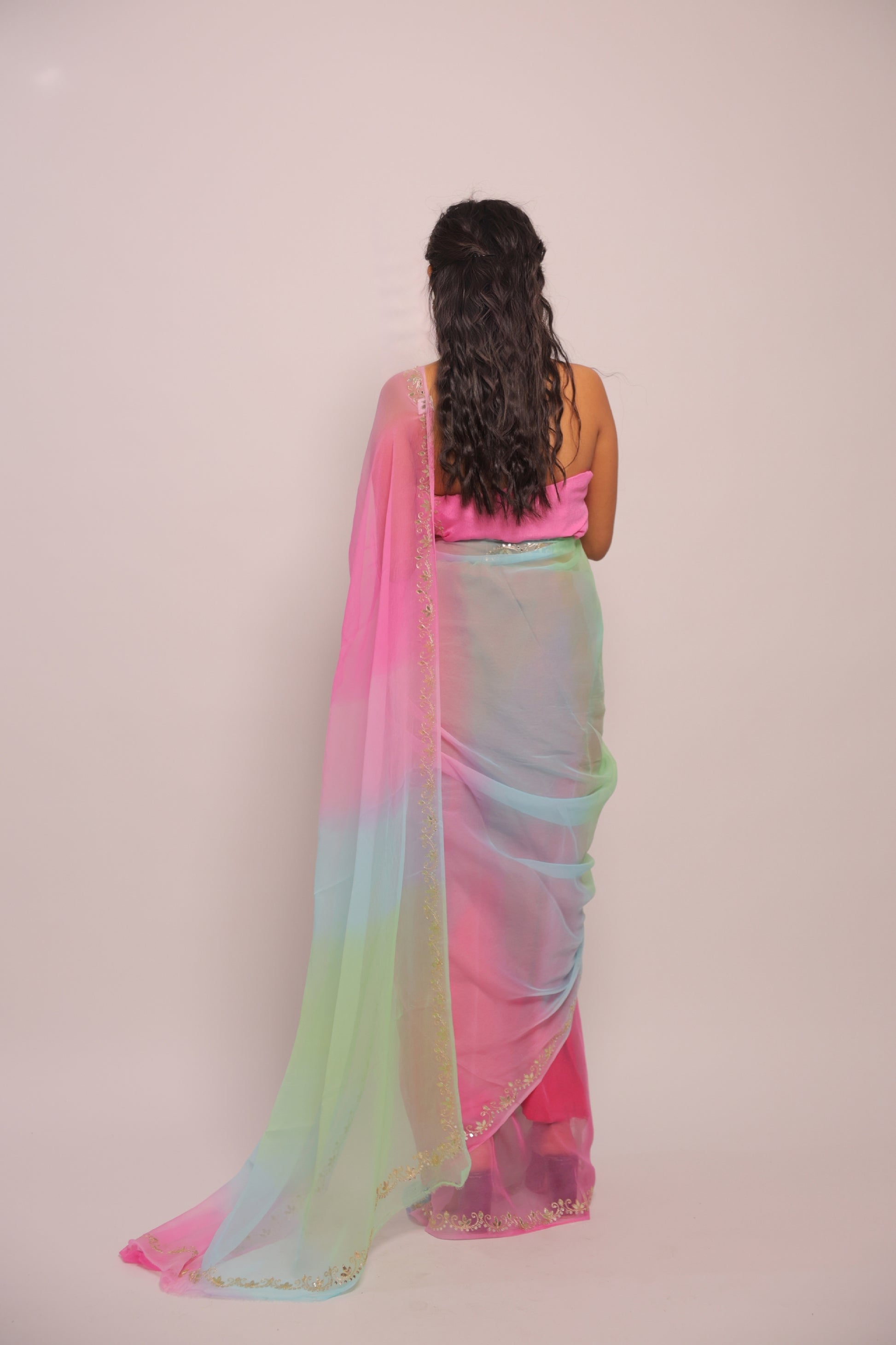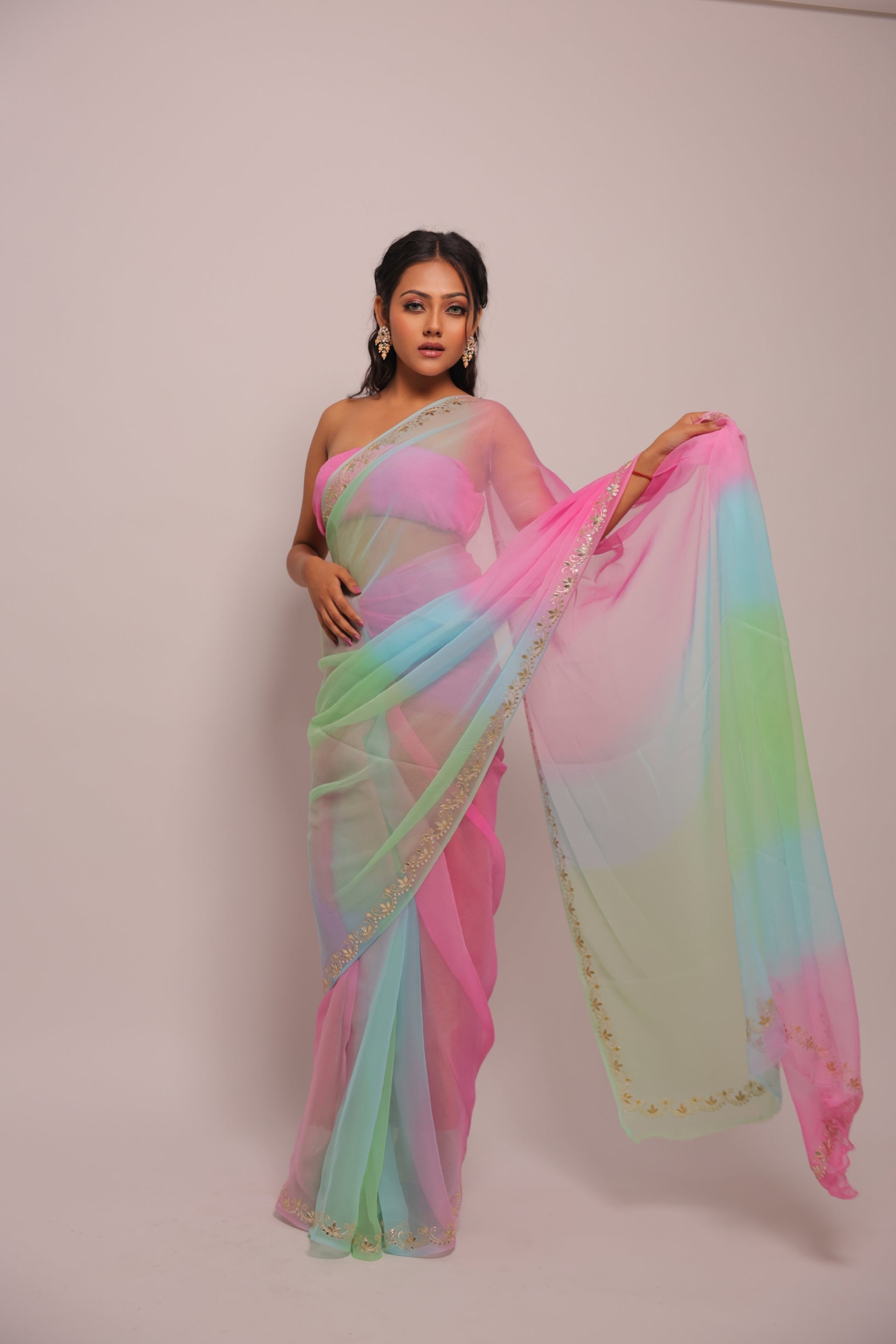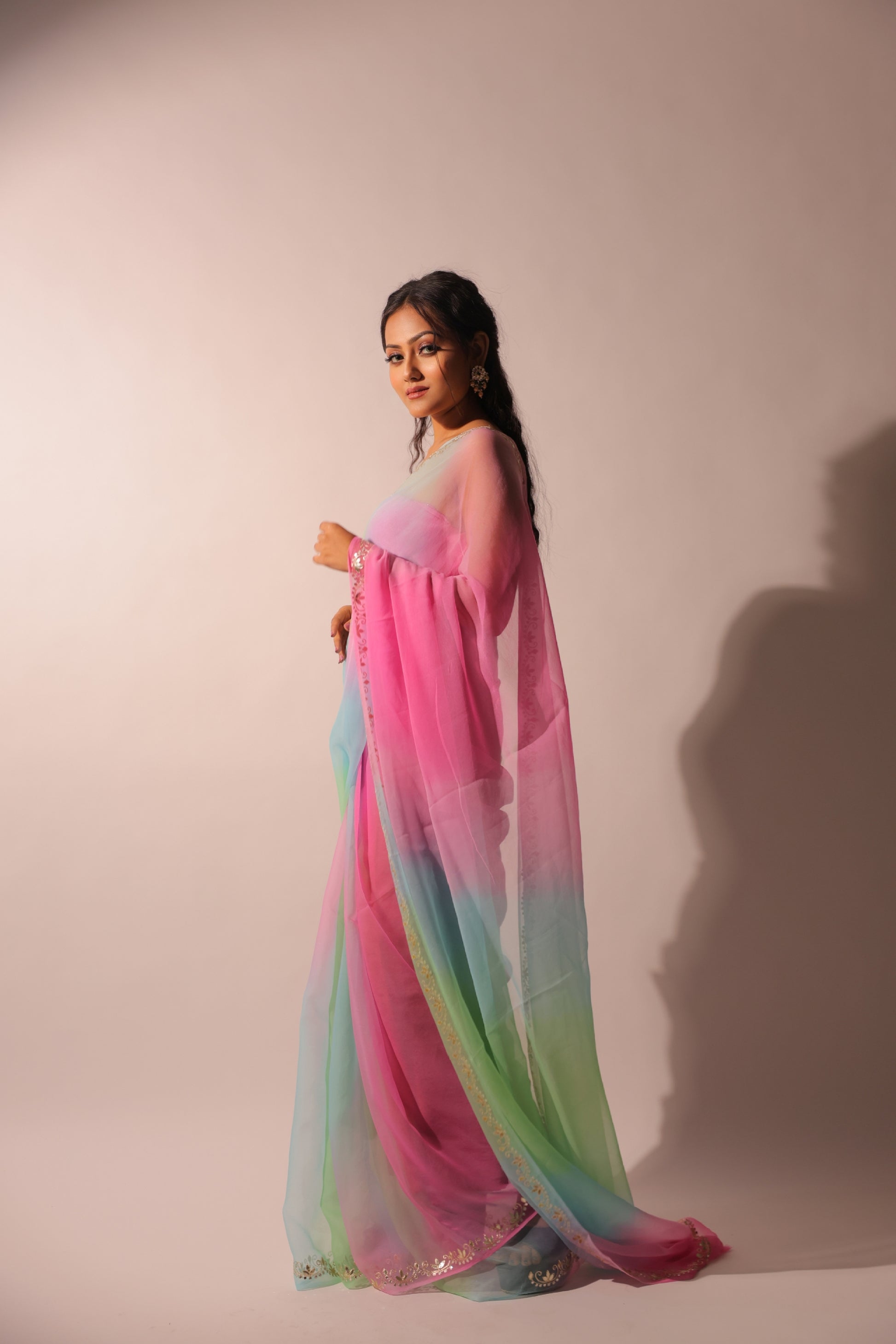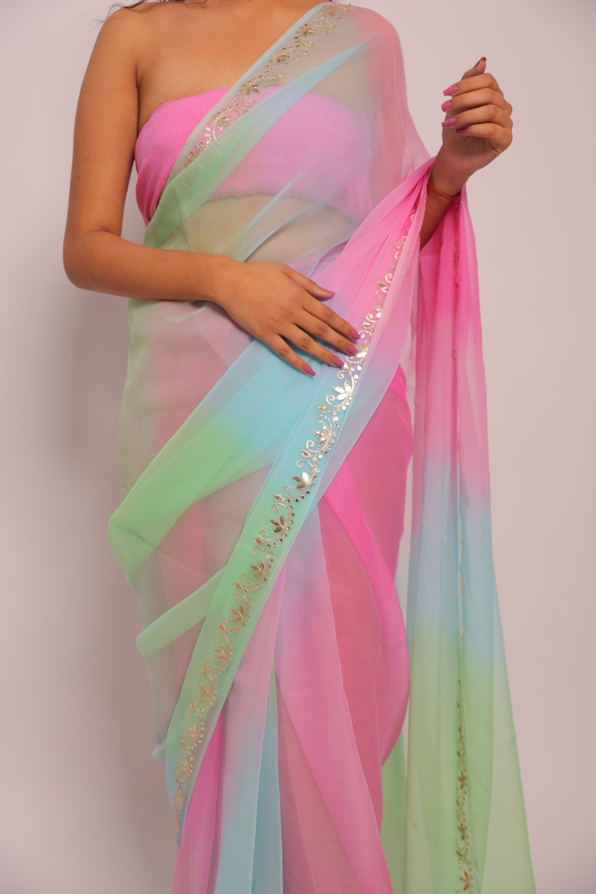 A hand-dyed multicolour base that brings together bold traditional tones, highlighted with fine, continuous gotta patti embroidery that shimmers with festive finesse.