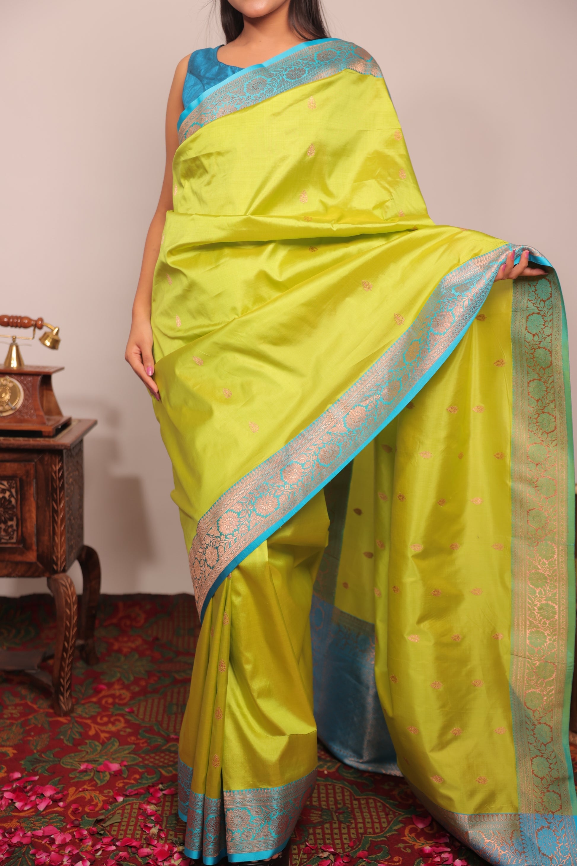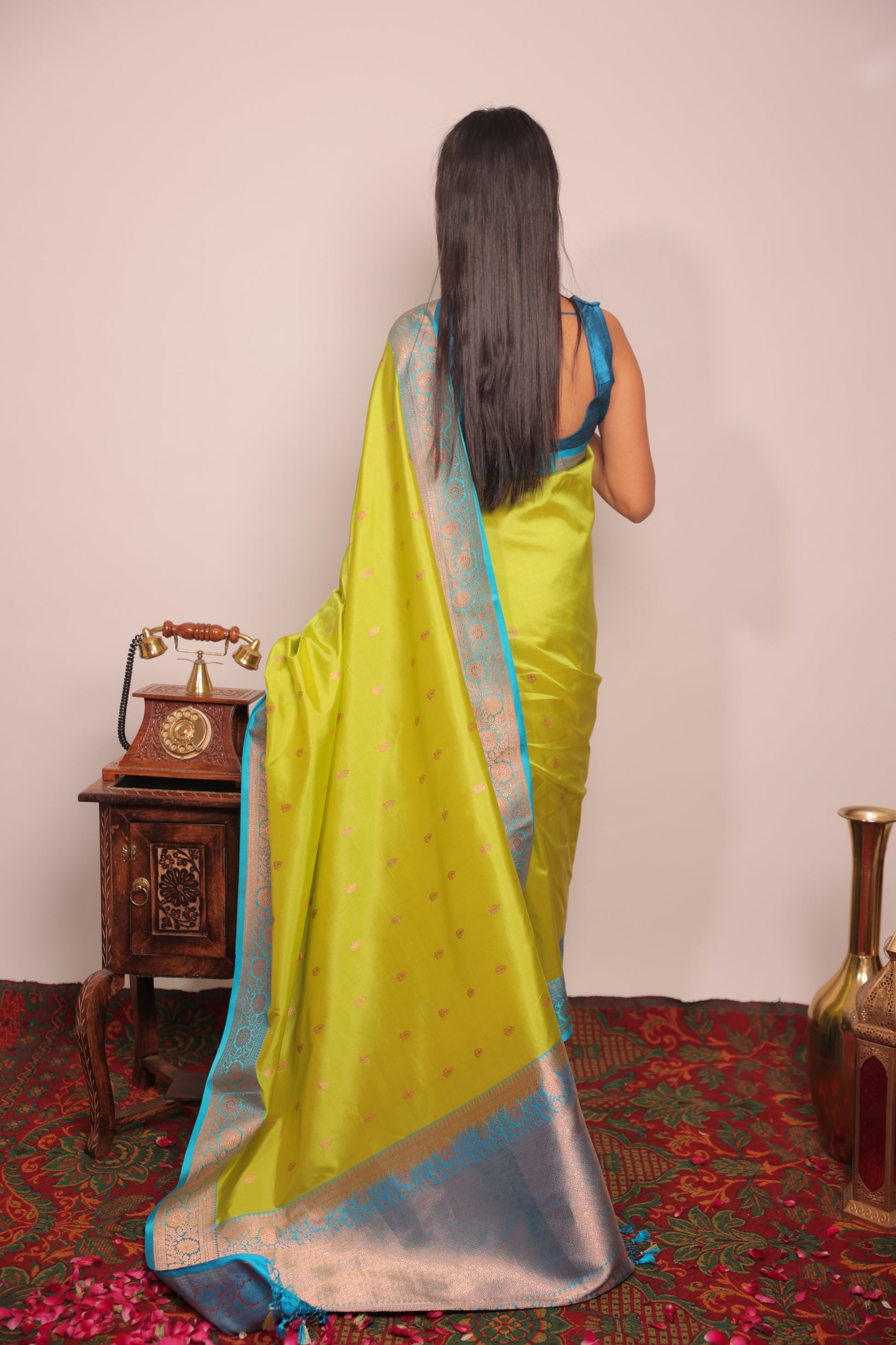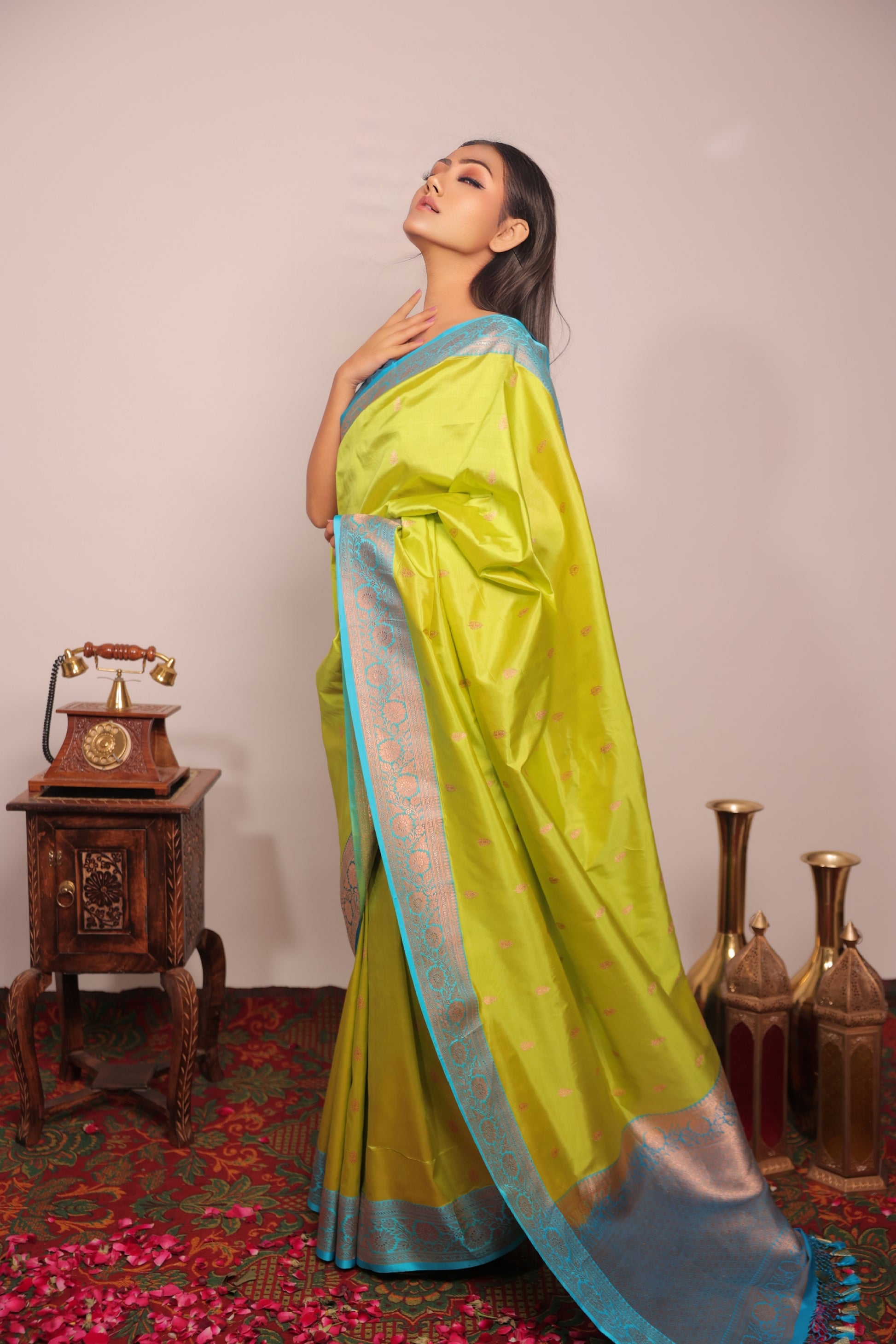 Water Lilies is a vibrant handloom Banarasi saree crafted from pure katan silk in a refreshing parrot green shade.