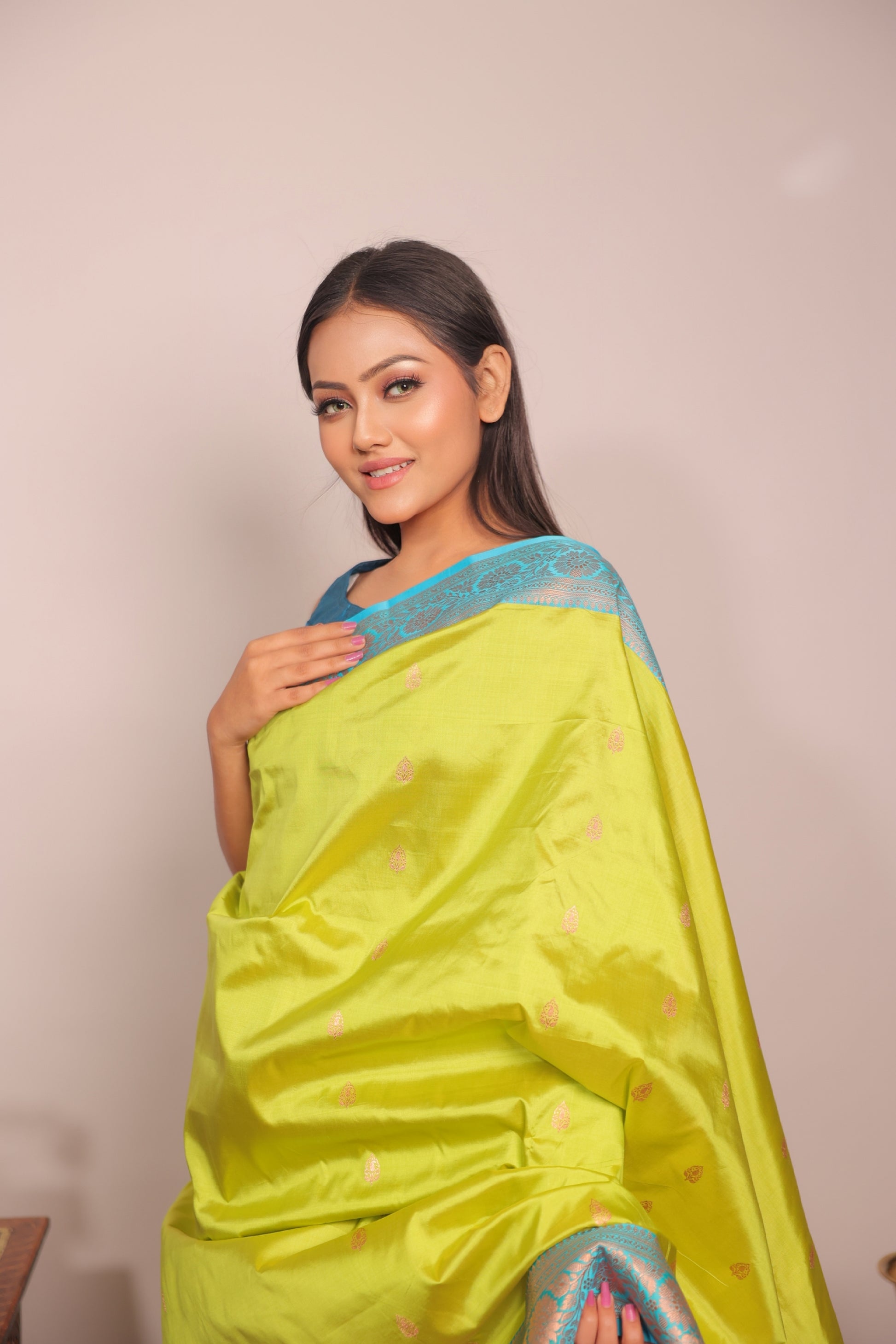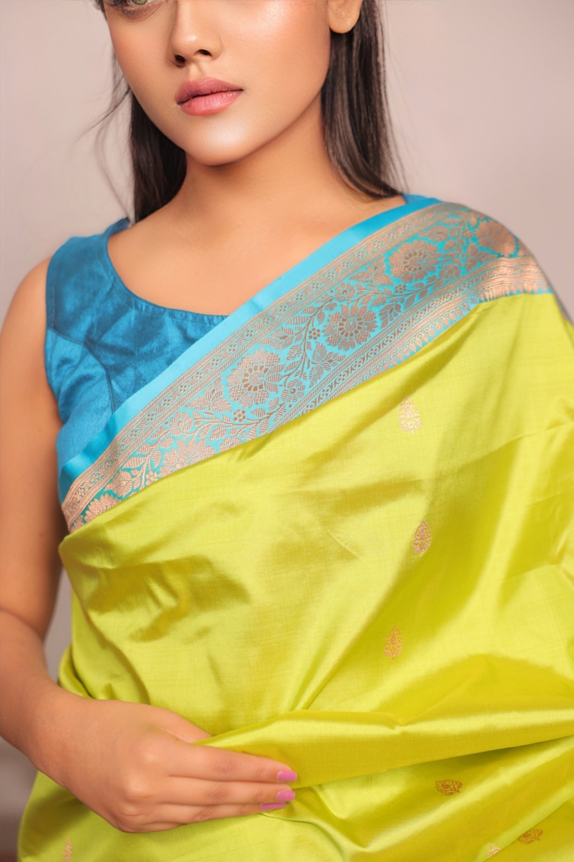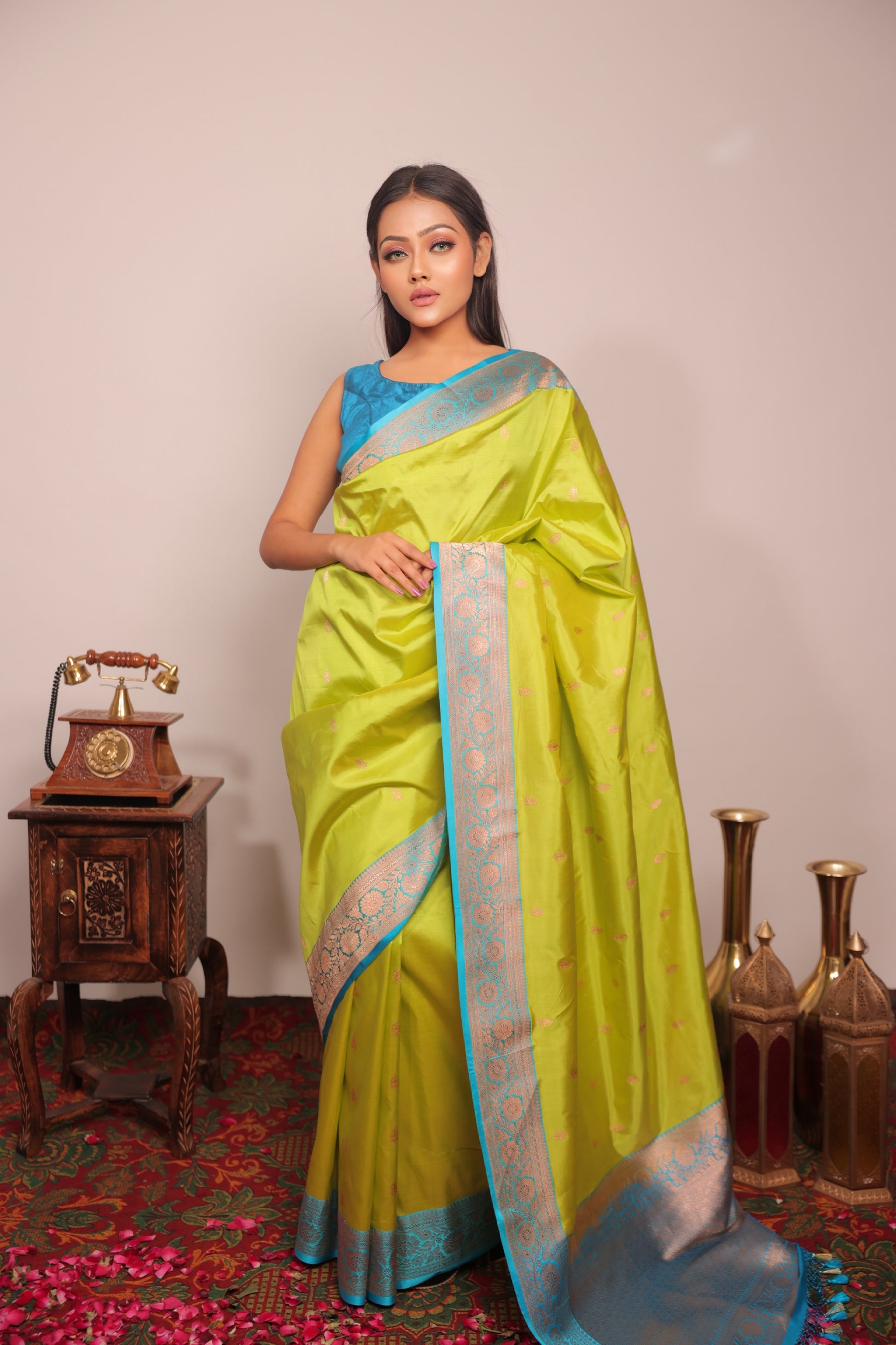 Water Lilies is a vibrant handloom Banarasi saree crafted from pure katan silk in a refreshing parrot green shade.